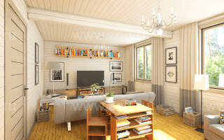 Главное преимущество этого коттеджа - функциональность. При относительно небольших габаритах в нем есть все, что нужно для комфортного загородного отдыха. Кроме гостиной и просторной кухни-столовой, объединенных студийной планировкой, на первом этаже имеется отдельная комната, которая может служить спальней для старших членов семьи.
