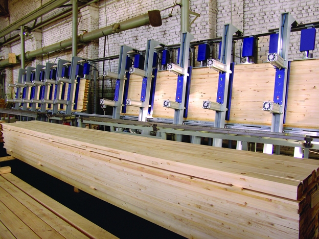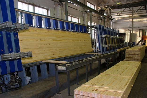 Отделение клееных деревянных конструкций – склейка ламелей. Основное технологическое оборудование – шесть электрогидравлических прессов Polzer EHLP 60-15-SA.